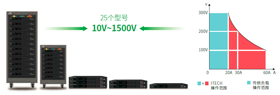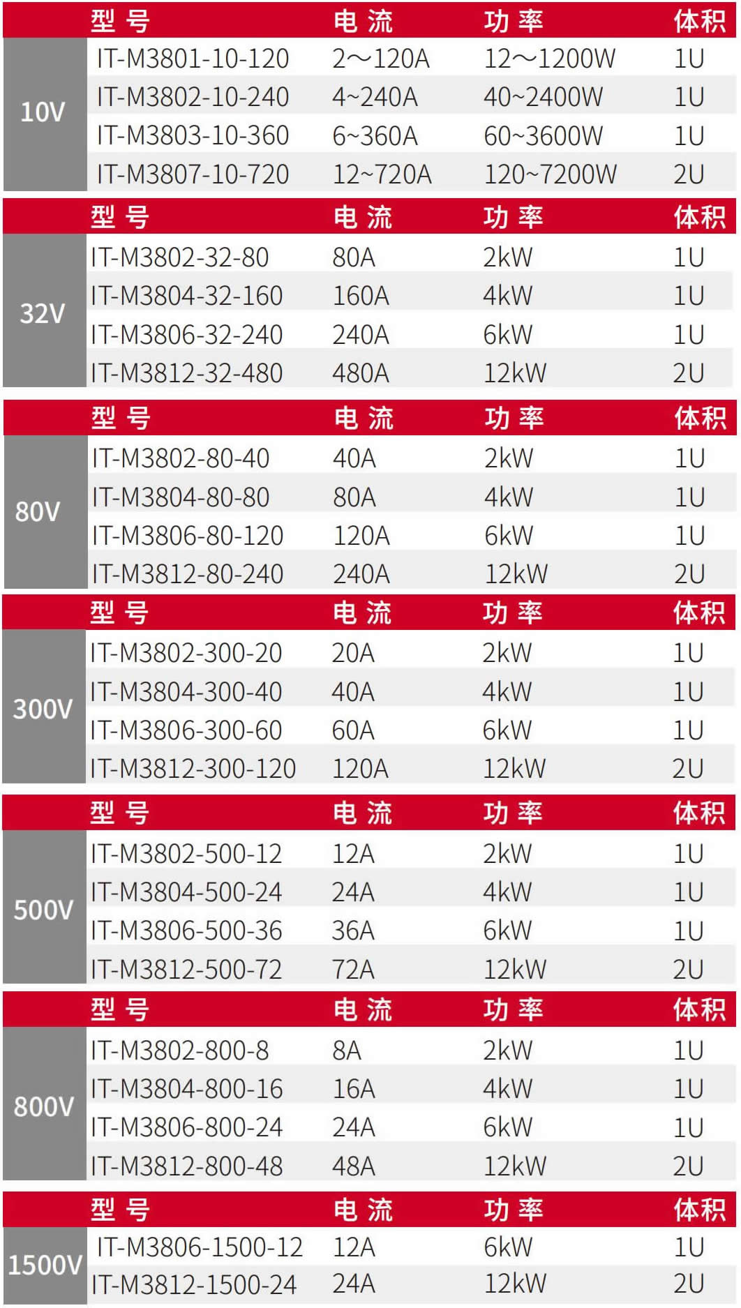 IT-M3800全系列共有25个型号,单机电压从10V到1500V,单机电流最大可达720A。采用宽范围的输出设计,相较于传统固定范围输出直流负载,为用户提供了更多的电压和电流组合,让使用更加灵活。单台负载就可以涵盖用户广阔范围的应用需求,大幅降低系统搭建的复杂度及占用空间。