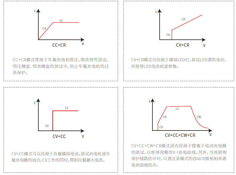 IT-M3800具备CC+CR、CV+CR、CV+CC和CC+CV+CW+CR等4种复合式操作模式,可适应于多种场合的测试需求。