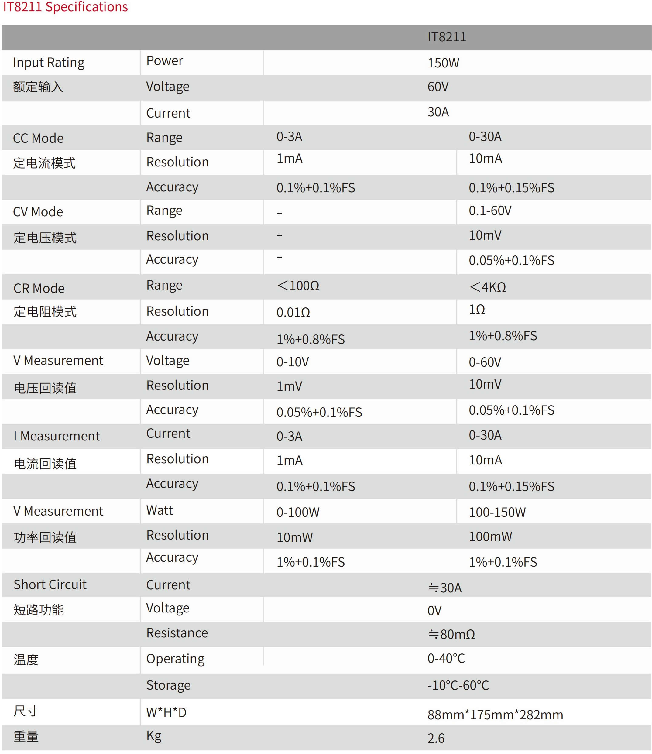 IT8211为高性价比电子负载,且具有小体积,广泛应用于产品生产线、维修等基础应用领域。该系列的分辨率为1mV/1mA,提供准确的测试结果。该系列可快速调用4*40组记忆数据,面板功能按键和显示界面清晰明了,提供客户简捷的操作方案,轻松并快速的完成各种复杂测试。该系列具备定电压、定电流和定电阻模式,以及短路测试的功能,是高性价比电子负载的优异产品。