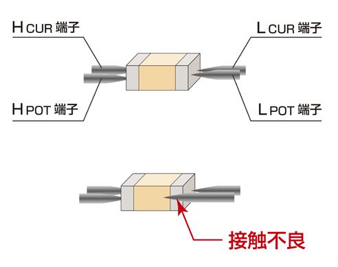 4端子测量时,预先设置判断测试端与被测物的接触状态。 测量LPOT〜LCUR间和HPOT〜HCUR间的接触电阻,并在超过所设阈值时发出报警信号。