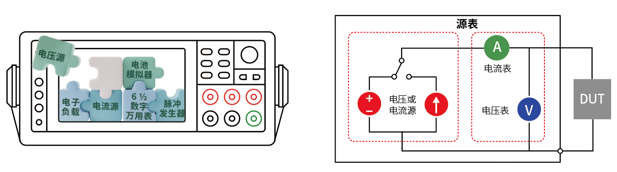 ♦集六种设备功能于一体:电压源、电流源、6 ½数字万用表(DCV,DCI, ohms)、电池模拟器、电子负载及脉冲发生器