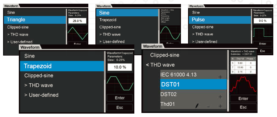 IT7800系列高压机型内建多种不同类型的波形,如三角波、正弦波、方波、锯齿波等波形,用户可以通过菜单调用并在LCD 屏幕上显示出选择的波形。用户也可以通过界面的自定义模式编辑波形,用以模仿及再现问题发生现场的真实电源波形。