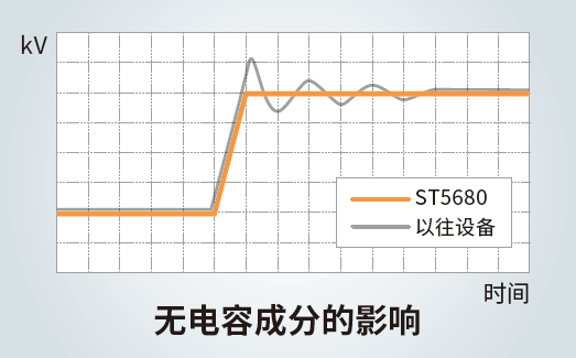 就算是测试对象含有电容成分的情况下,因为有不易发生过冲的设计,不会对测试对象输出超过设置电压的电压,所以可以放心进行测试。