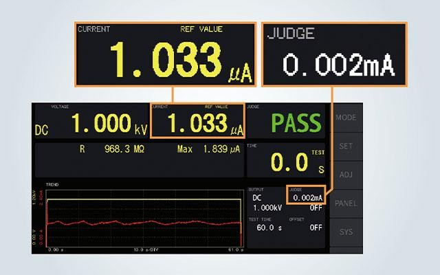 随着电池和电机等绝缘性能的提高,对判断耐压测试合格与否的电流值设置要求也越来越高,要求设置为更小的电流。如果使用分辨率低的耐压测试仪,则无法准确测量泄漏电流的测量值。ST5680EOL实现了最小分辨率0.001uA的高精度规格,因此可以正确测量微小的泄漏电流,判断合格与否。