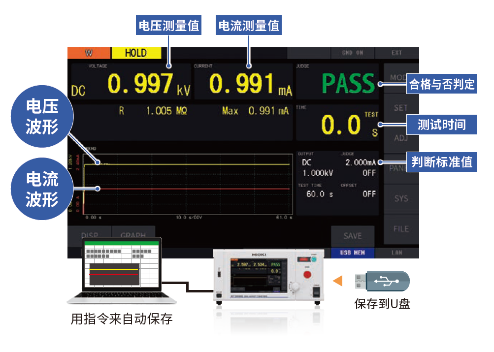 不仅可以进行PASS/FAIL的合格与否判定,也可以显示、记录测试时的输出电压波形和泄漏电流波形。