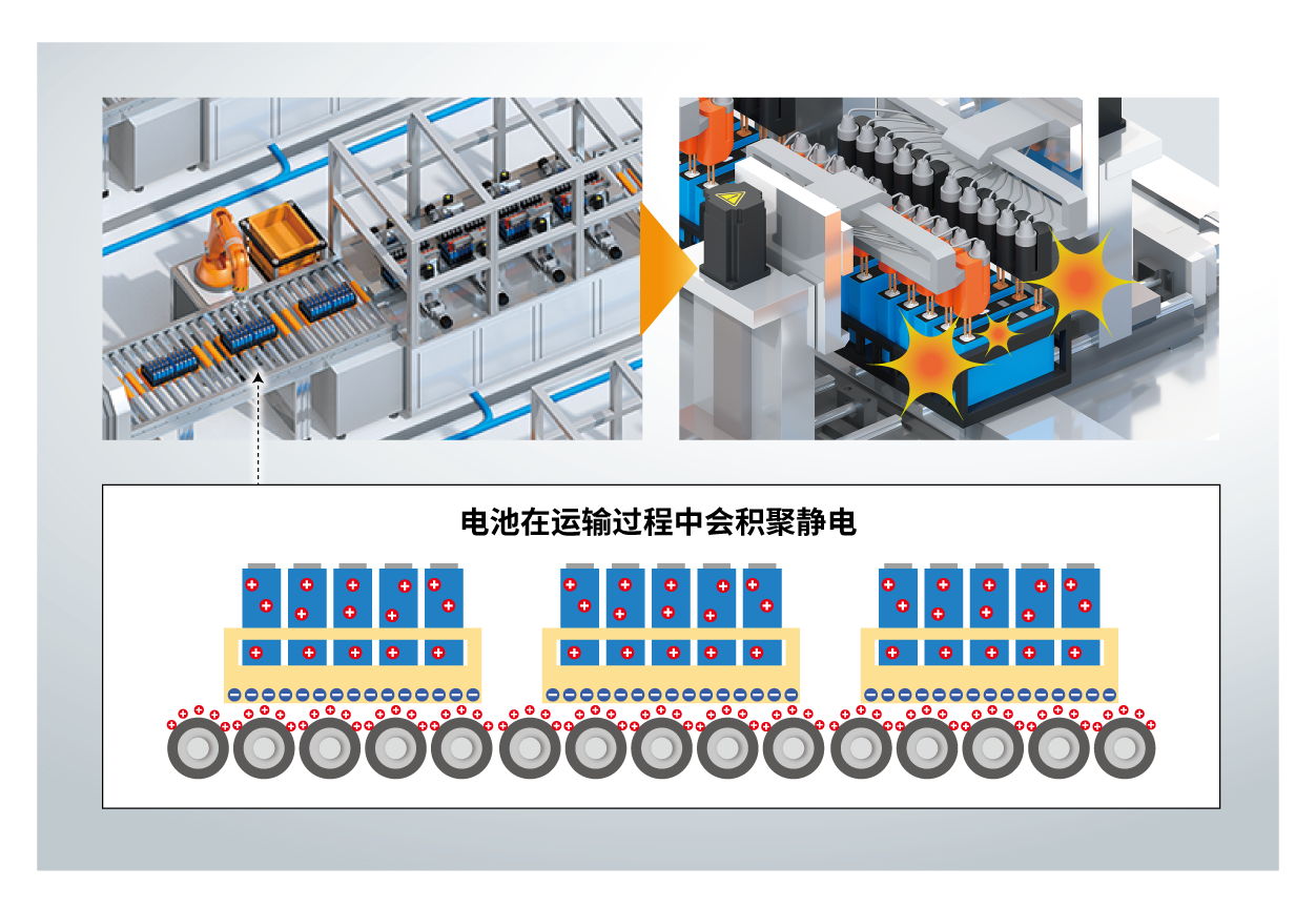 在生产线上,电池在传送带等上传输时会带电。电池与探头接触的话,会引起测量仪器 带电、导致故障发生。