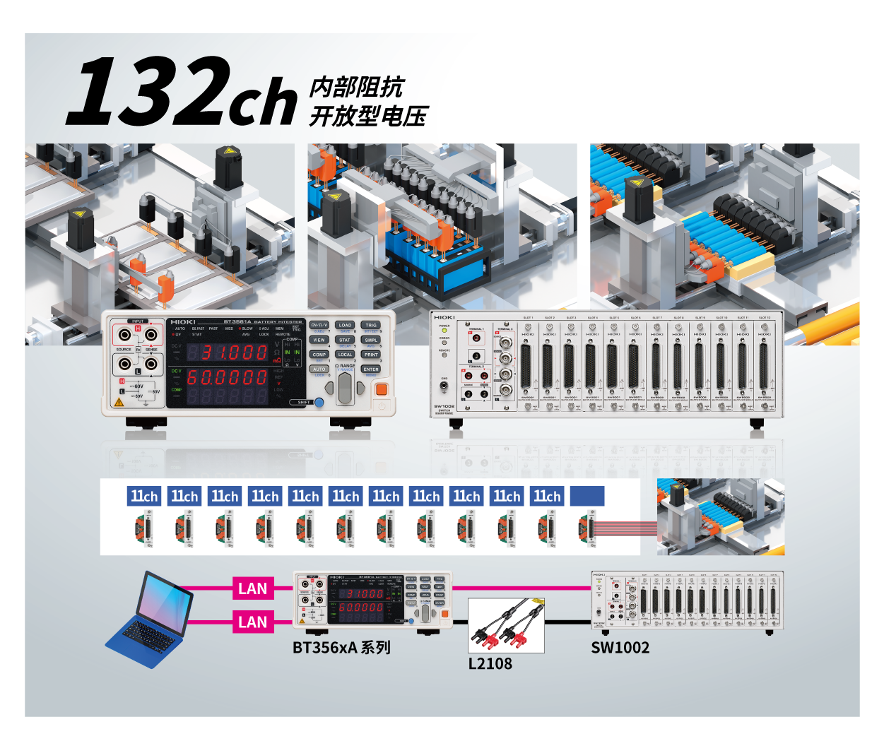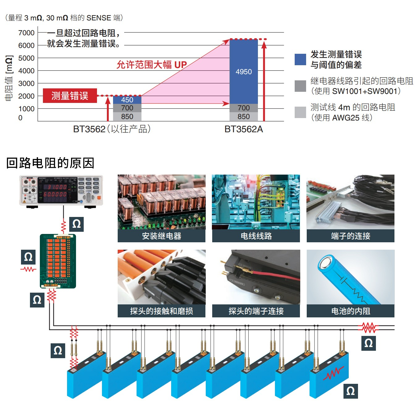 最大1000 V输入电压的机型( BT3564 ),可以统一测量电池组包总电阻。
