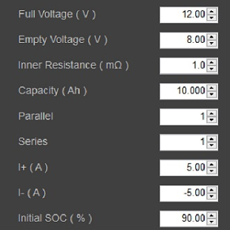BSS2000系列电池模拟软件提供基本的电池数学模型,使用者仅需要配置简易的电池信息,软件自动生成对应的电池特性曲线。参数配置包括:电池满电压,空电压,额定容量,串并联节数及电池内阻等,对于非电池研发类的人员也能轻松实现电池特性仿真。