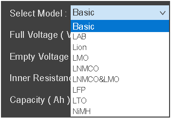 BSS2000系列软件为用户内建丰富的电池特性曲线库,使用者仅需要选择对应的电池类型,配置基本的容量及保护参数,即可快速生成对应类型的电池特性曲线。BSS2000基础版软件提供锂电池和铅酸电池类型,BSS2000 Pro及BSS2000M软件提供高达8种电池类型曲线,分别是锂电池,铅酸电池,磷酸铁锂,三元锂,锰酸锂,钛酸锂,镍钴锰酸锂及镍氢电池。
