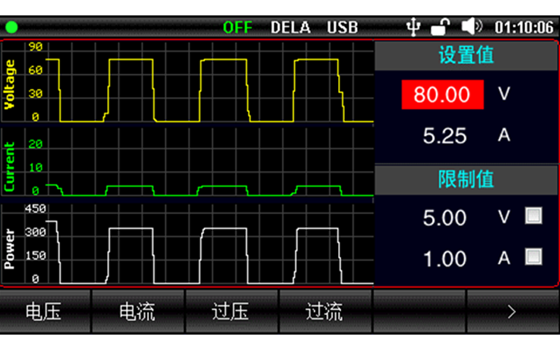 UDP6722系列应用了4.3'' LCD 高清液晶显示屏,读数一目了然,操作简单易懂。实时显示电源当前设定的输出电压/电流、实际输出电压/电流以及保护输出电压/电流值;同时用户还能够便捷的进行系统的设置,此人性化设置可以满足工程师测试中的多种应用需求。
