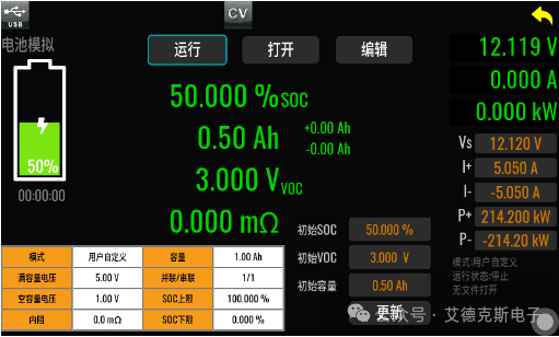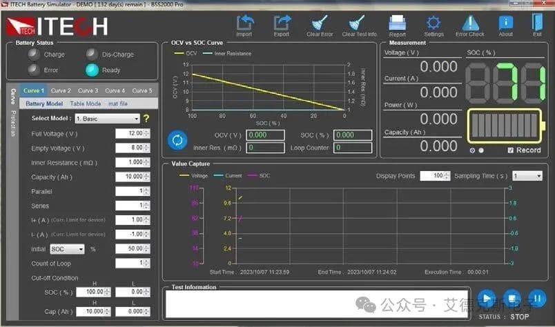 值得一提的是,IT16000C内置电池模型为用户提供快速的电池曲线仿真功能。用户可以通过5寸触摸屏,自由选择“用户自定义电池模拟”模式或者“电池曲线仿真”模式,快速设置电池的电压、容量、内阻、SOC,轻松定义电池模型,实现电池的充/放电模拟。同时,用户也可以选配ITECH专业的BSS2000电池模拟软件,使用软件内建的常用电池类型配置串并联参数,仿真不同类型不同容量的电池模组特性曲线。软件支持用户导入matlab电池模型或通过csv文件导入实际的电池充放电曲线,进而验证电池在实际应用中的适配性。